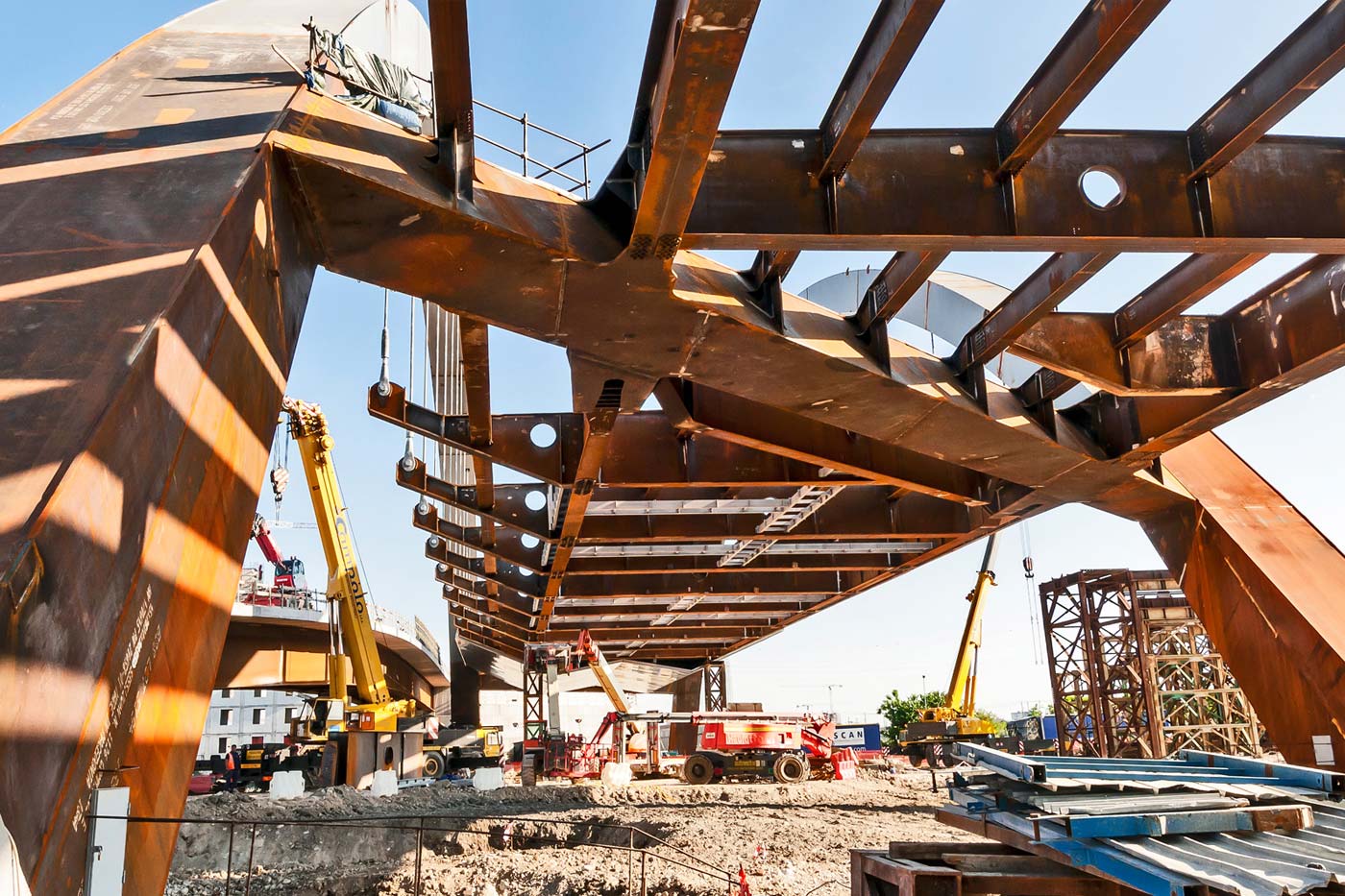 Lunghezza totale 265 m; 5 campate (53 m ciascuna); struttura mista acciaio/cls; rivestimento con pannelli di alucobond